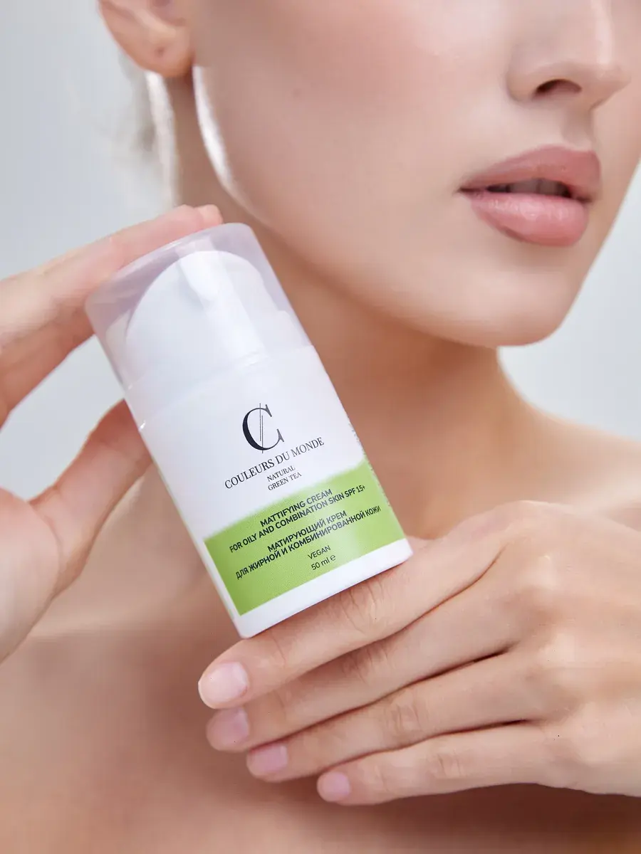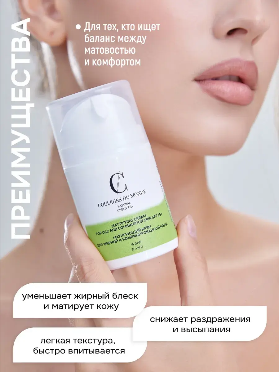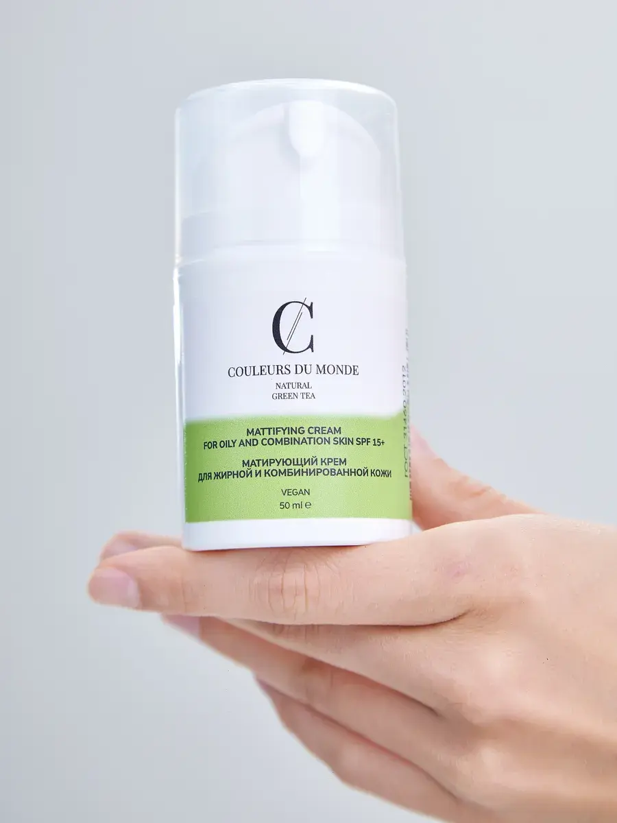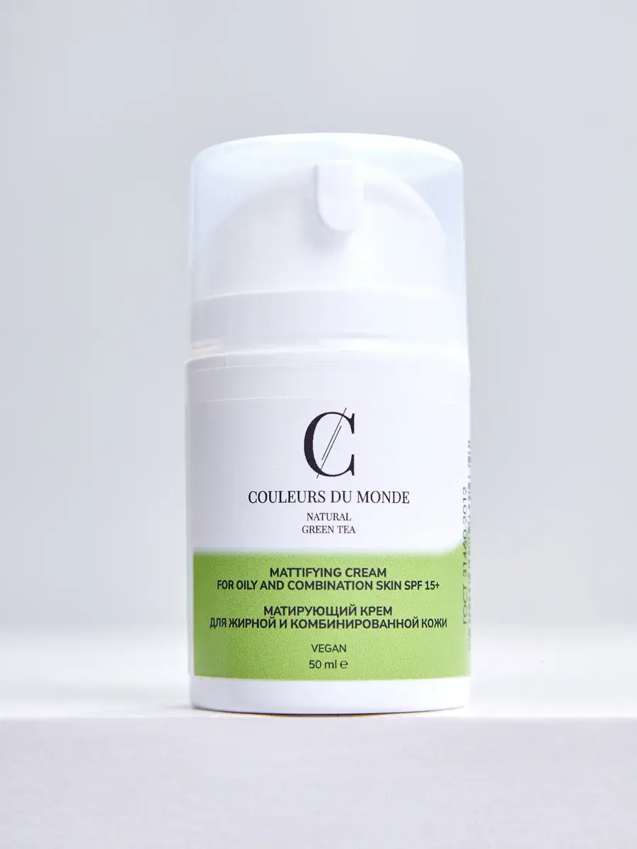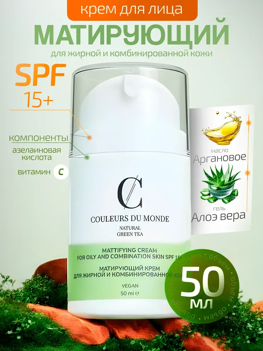 Натуральный матирующий крем для лица с зеленым чаем и SPF 15+ от бренда Couleurs du monde — это универсальное средство для ухода за кожей. Он обеспечивает увлажнение, питает витаминами А, В, С, Е и РР, защищает от солнца и помогает выравнивать тон кожи. Формула с азелаиновой кислотой способствует сужению пор на лице, предотвращает появление черных точек и борется с несовершенствами. Подходит для комбинированной и жирной кожи, эффективно регулирует блеск и улучшает состояние проблемной кожи.