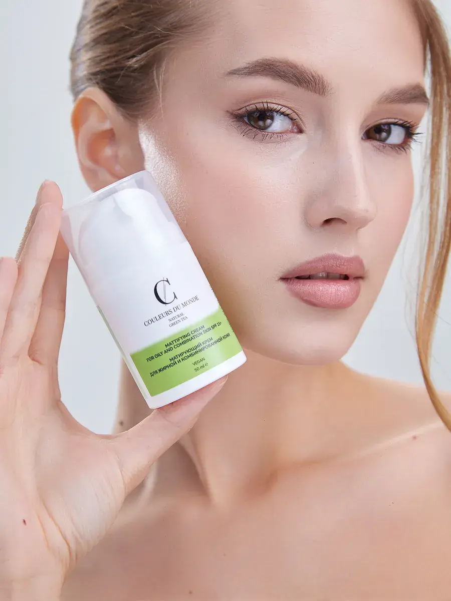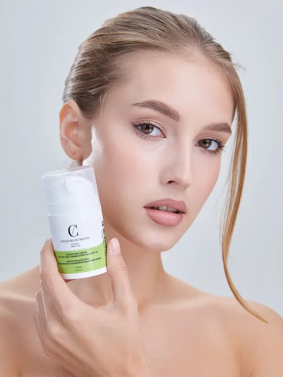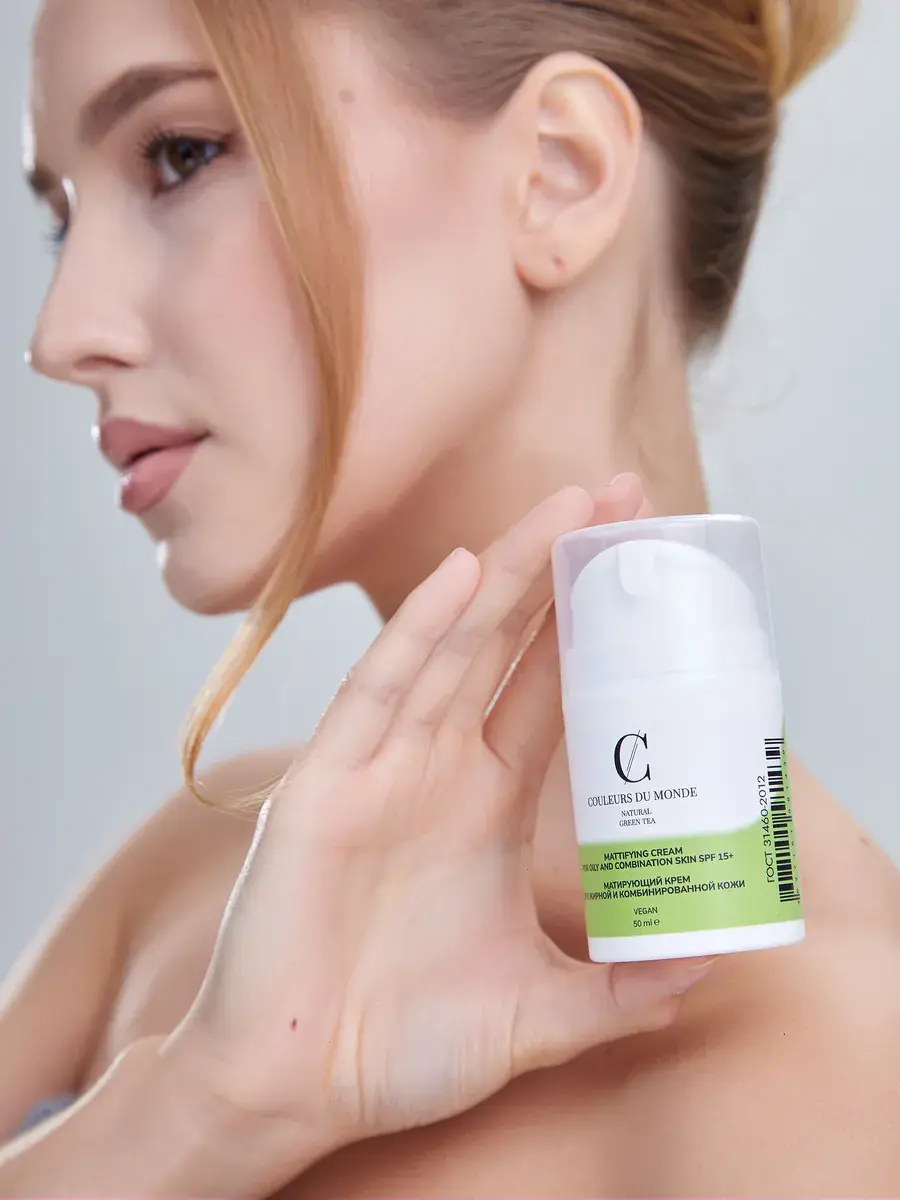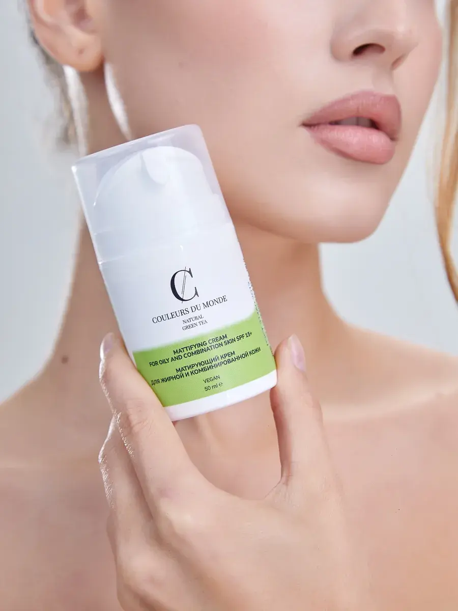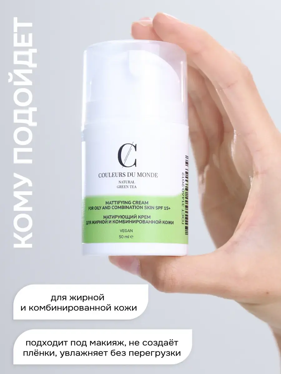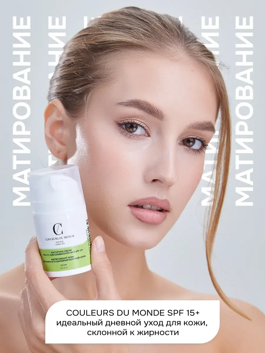 Натуральный матирующий крем для лица с зеленым чаем и SPF 15+ от бренда Couleurs du monde — это универсальное средство для ухода за кожей. Он обеспечивает увлажнение, питает витаминами А, В, С, Е и РР, защищает от солнца и помогает выравнивать тон кожи. Формула с азелаиновой кислотой способствует сужению пор на лице, предотвращает появление черных точек и борется с несовершенствами. Подходит для комбинированной и жирной кожи, эффективно регулирует блеск и улучшает состояние проблемной кожи.