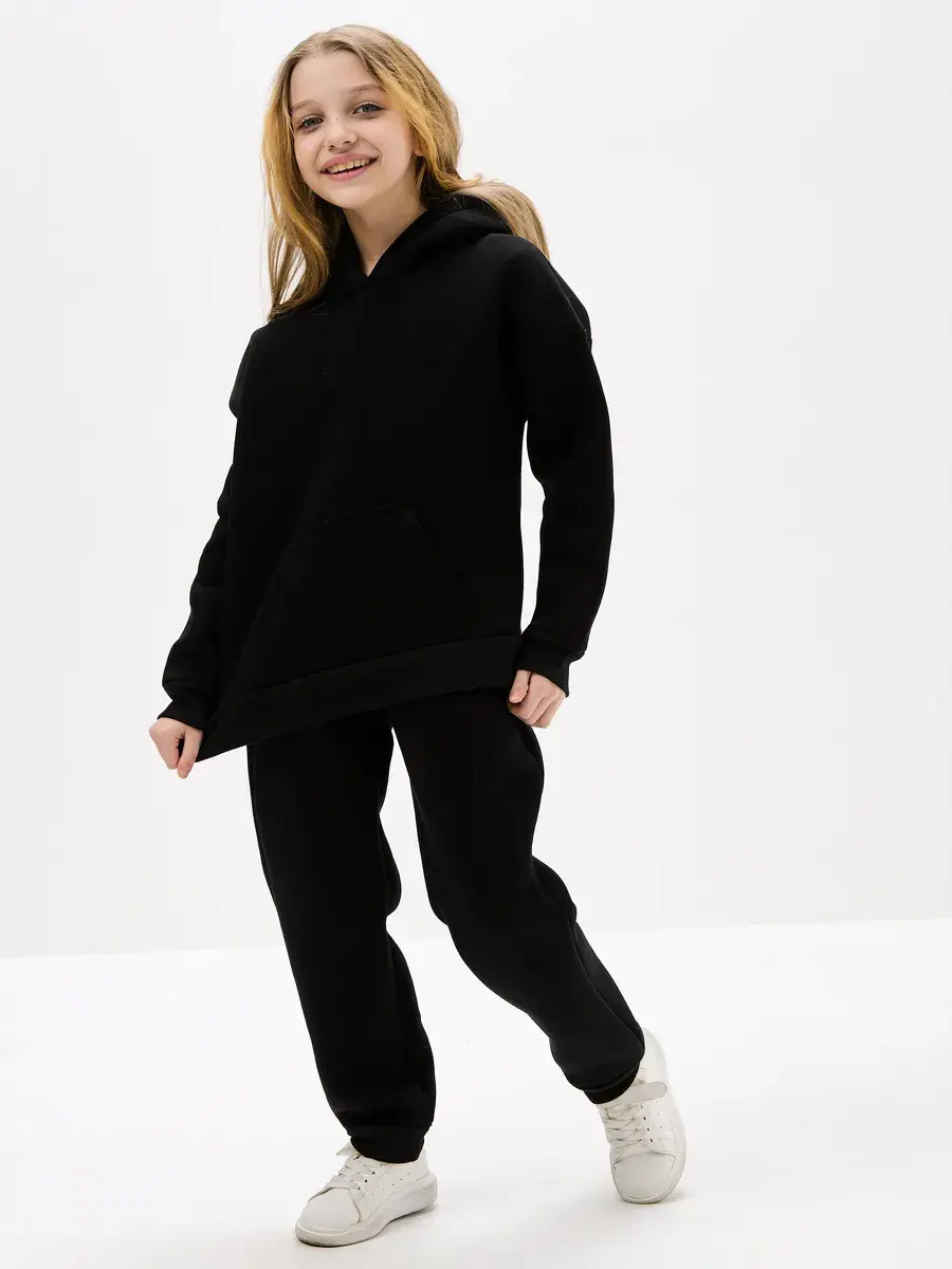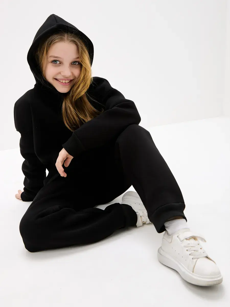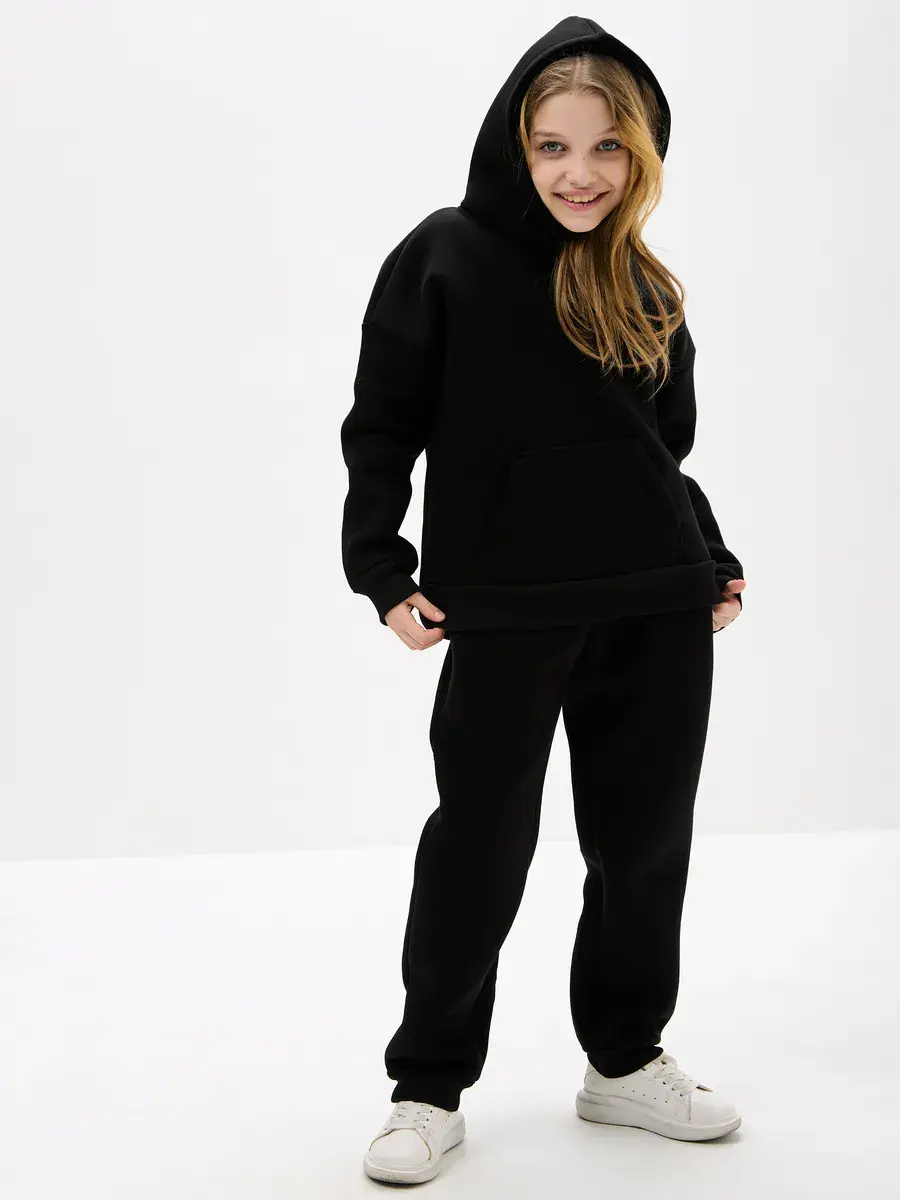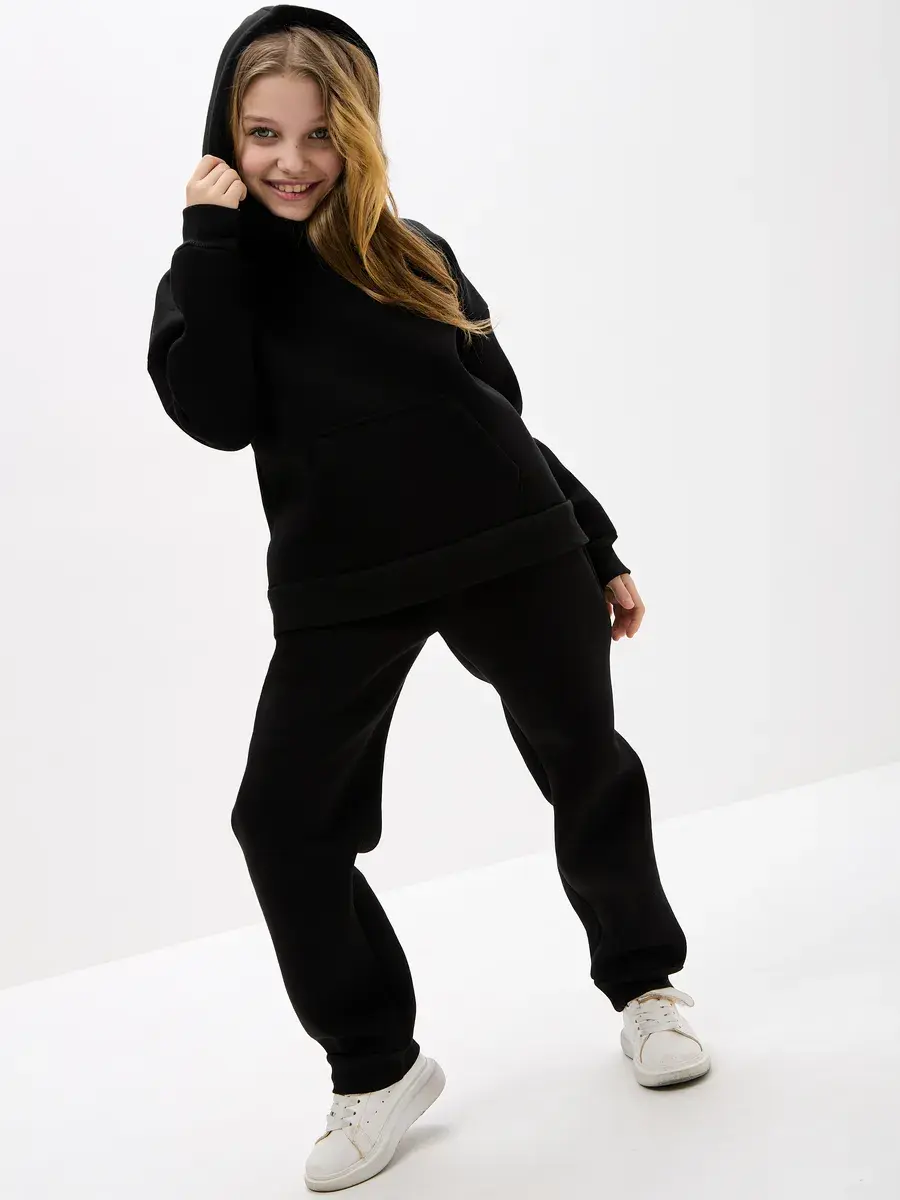 Однотонная черная расцветка позволяет легко сочетать вещи комплект с другими вещами. Брюки имеют прямой крой с удобной резинкой на талии. Худи с капюшоном обеспечивает дополнительную защиту от ветра. Это универсальная вещь может стать частью базового гардероба у школьника.