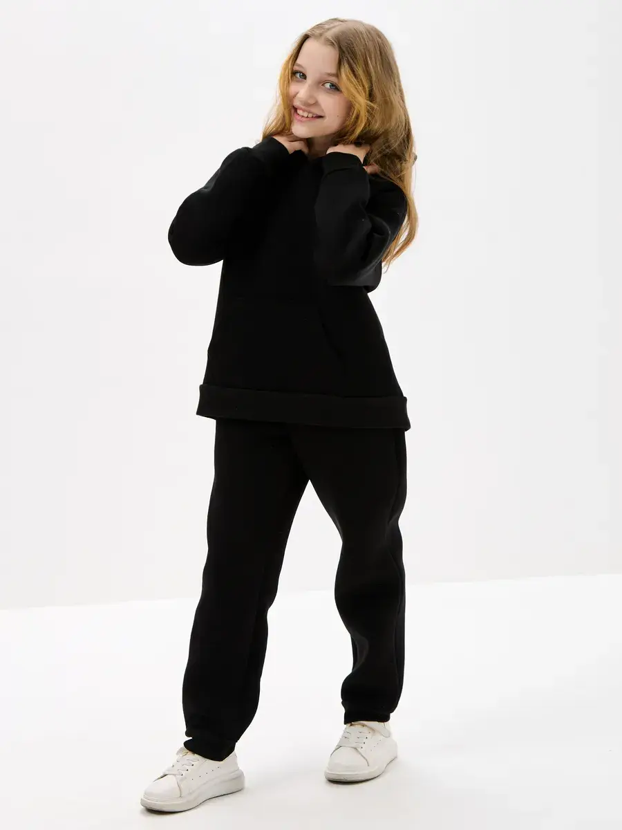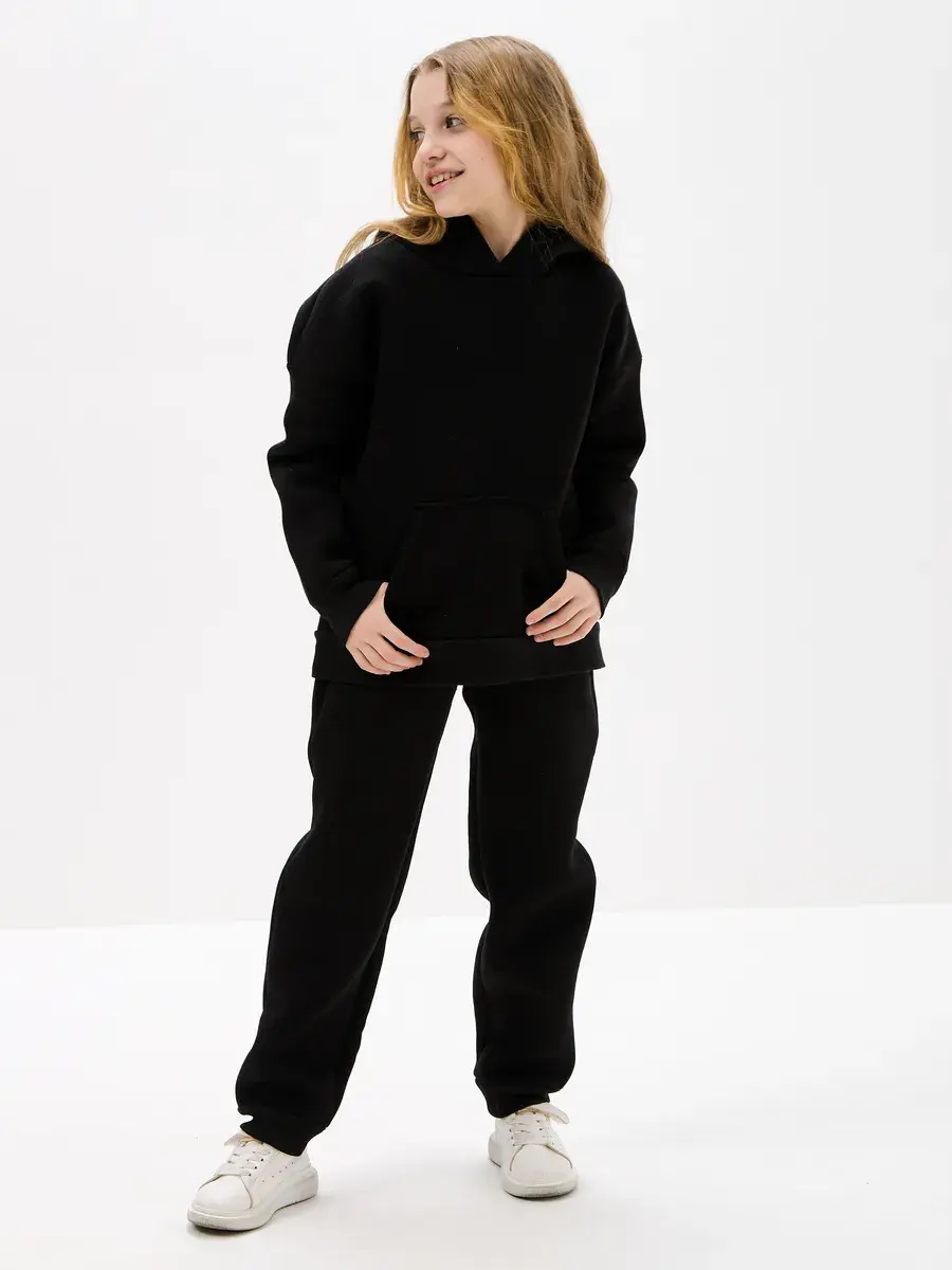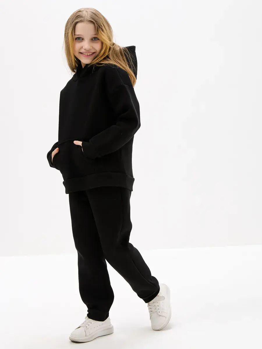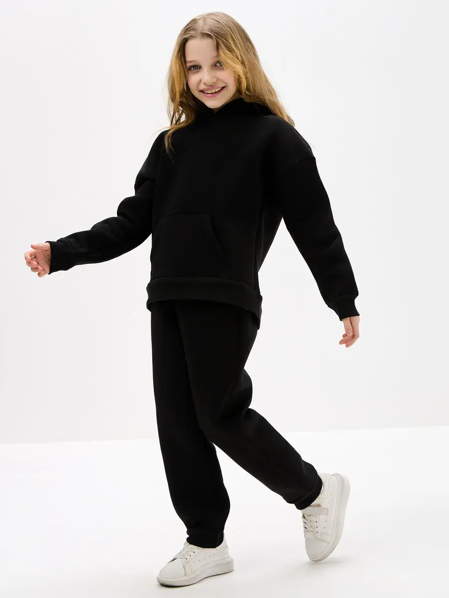 Однотонная черная расцветка позволяет легко сочетать вещи комплект с другими вещами. Брюки имеют прямой крой с удобной резинкой на талии. Худи с капюшоном обеспечивает дополнительную защиту от ветра. Это универсальная вещь может стать частью базового гардероба у школьника.