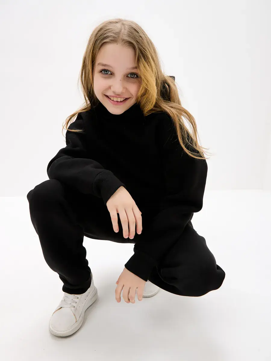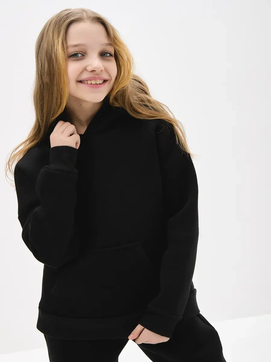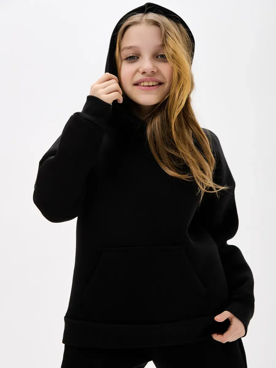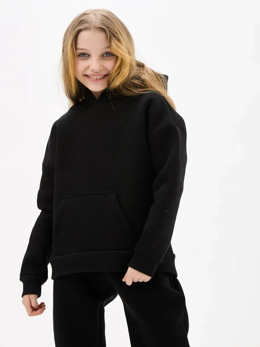Однотонная черная расцветка позволяет легко сочетать вещи комплект с другими вещами. Брюки имеют прямой крой с удобной резинкой на талии. Худи с капюшоном обеспечивает дополнительную защиту от ветра. Это универсальная вещь может стать частью базового гардероба у школьника.